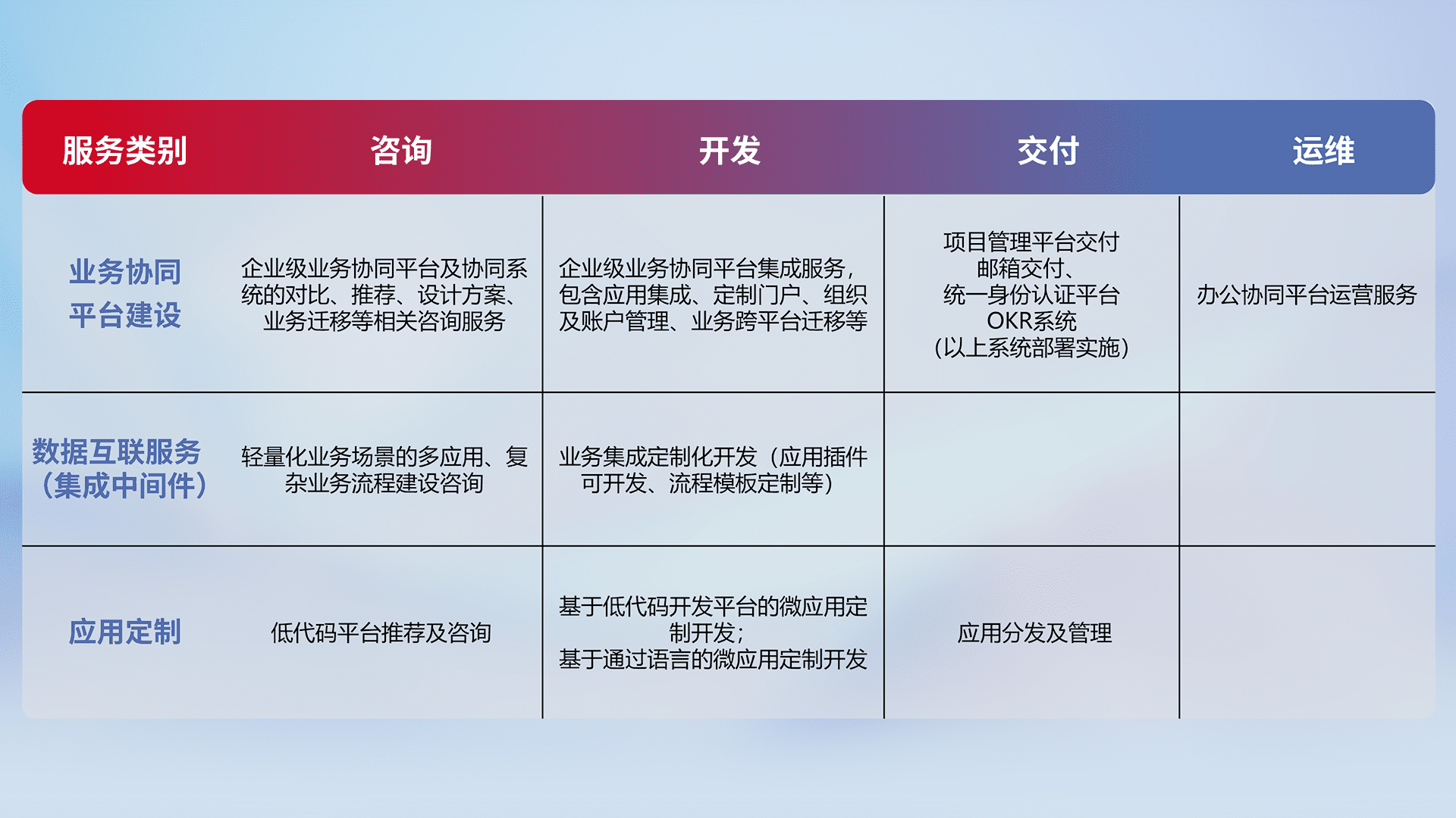 针对钉钉、、企微、、IDaas等平台级产品提供产品的规划、、方案、、、交付、、定制化开发等服务,,实现如统一协同办公、、、、智能客户服务、、、混合会议管理、、、、智能数据查询、、、、等业务场景,,,实现数字化转型。。。。