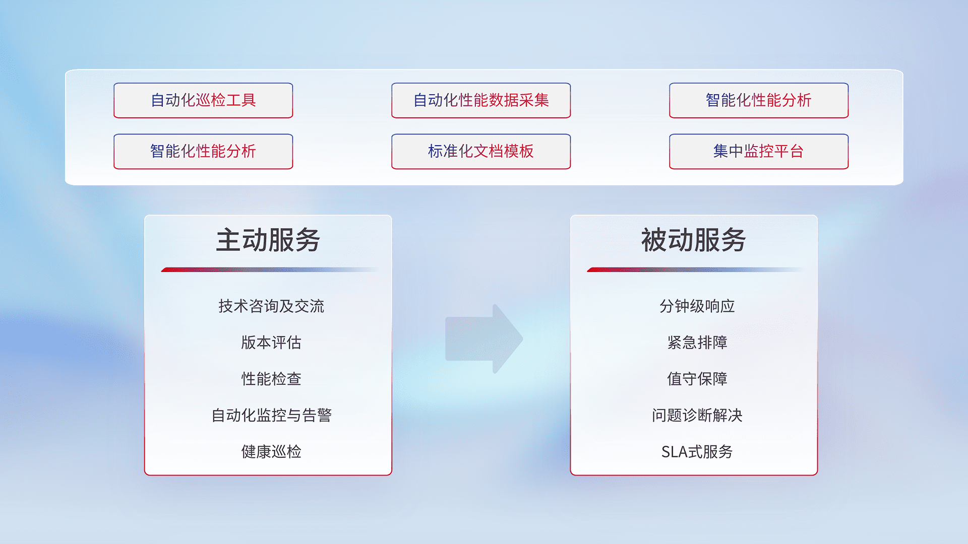 智能化工具和标准化文档,,保障服务质量,,提供主动服务(包含技术咨询、、版本评估、、、性能检查、、自动化监控与告警、、健康巡检)和被动服务包含(分钟级响应、、、紧急排障、、、、值守保障、、、问题诊断解决、、SLA服务)。。。